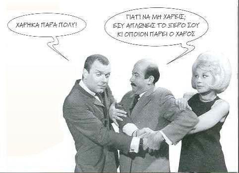 Γιώργος Τζιφός: Ό,τι καταλαβαίνεις. Θανάσης Βέγγος: Λέγε εσύ και άσε τι καταλαβαίνω εγώ! Γιώργος Τζιφός: Δώσε ένα εικοσάρι. Θανάσης Βέγγος: Πώς το ΄πες αυτό ρε Βαγγέλη; Για τρελούς ψάχνεις; Γιώργος Τζιφός: Γιατί κυρ Αντώνη, πολλά σου είπα; Θανάσης Βέγγος: Τι έκανες ρε και θέλεις ένα εικοσάρι; Δυο πραγματάκια πήρες, τα φόρτωσες, και τα ξεφόρτωσες εδώ χάμω. Πόσο βάσταξε αυτή η δουλειά; Βάσταξε μισή ώρα; Γιώργος Τζιφός: Άντε κυρ Αντώνη, δώσε ένα εικοσάρι τώρα να τελειώνουμε! Θανάσης Βέγγος: Ένα εικοσάρι για μισή ώρα. Στην ώρα σαράντα και στο οχτάωρο, τέσσερις οχτώ τριανταδύο, τρακόσες είκοσι. Και το μήνα, τρεις τριανταδύο ενενήντα έξι. Εννιά εξακόσες το μήνα; Ποιος είσαι εσύ ρε που παίρνεις εννιά εξακόσες το μήνα; Ρωτάς αν τα παίρνει ένας αντιναύαρχος εν ενεργεία; Για δέτε ρε έναν αντιναύαρχο εν ενεργεία! Γιώργος Τζιφός: Έξι δραχμές μου δίνεις κυρ Αντώνη; Θανάσης Βέγγος: Μάλιστα, έξι δραχμές! Στην ώρα δώδεκα και στο οχτάωρο οχτώ η δώδεκα ενενηνταέξι. Και το μήνα τρεις η ενενήντα έξι, διακόσες ογδόντα οχτώ. Δύο οχτακόσες ογδόντα το μήνα Βρε, τόσα παίρνει ένας γυμνασιάρχης, που έχει μάλιστα να κάνει με τετρακόσιους αρκουδόμαγκες που τον σταυρώνουν από το πρωί ως το βράδυ. Γιατί εσύ έχεις την απαίτηση να παίρνεις πιο πολλά από το γυμνασιάρχη; Άλλο τούτο πάλι! Ο Βαγγέλης γυμνασιάρχης! Μνήστιτί μου κύριε! Γιώργος Τζιφός: Άντε, βάλε δυο τάλιρα ακόμα να τελειώνουμε. Θανάσης Βέγγος: Έλα, πάρε κι αυτό και είσαι εντάξει. Γιώργος Τζιφός: Τι ΄ν΄ αυτό; Θανάσης Βέγγος: Αν κάνεις λογαριασμό, θα δεις ότι είσαι πληρωμένος με μισθό τμηματάρχου! Πήγαινε τώρα γιατί έχουμε κι άλλες δουλειές... Κατάλαβες φίλε μου; Γίνανε κι οι χαμαλαραίοι τμηματάρχες... ![]() Θανάσης Βέγγος: Κι εμείς εδώ το έχουμε αυτό, αλλά με κατσαρίδες! | |